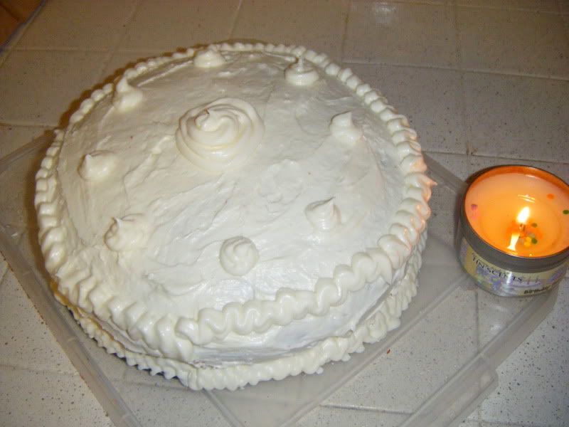 We searched 3 different stores to find a bottle of red food coloring so we could avid the expense of buying to multi-color packs we didn't need. We found a huge bottle at Smart and Final for a few bucks which was great. They also carry huge packs of jell-o and the perfect size plastic condiment cups and lids to make jell-o shots or kid-friendly jigglers. This was also our first basic cake decorating attempt. I used a new pastry bag and tip set I got for $5 at Ikea and it worked pretty well